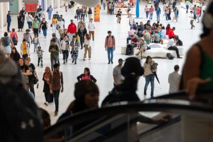 © Reuters. FILE PHOTO: People on a property tour talk outside of a show flat at a residential property developed…
