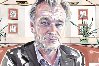 Christopher Nolan enters the dining room in a dark sports jacket and blue button-down shirt, far exceeding the dress requirements…