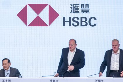 Noel Quinn, chief executive officer of HSBC Holdings Plc, right, Mark Tucker, chairman, center, and Peter Wong, deputy chairman, during…