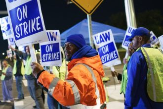 © Reuters. FILE PHOTO: United Auto Workers members hold up strike signs across from the…