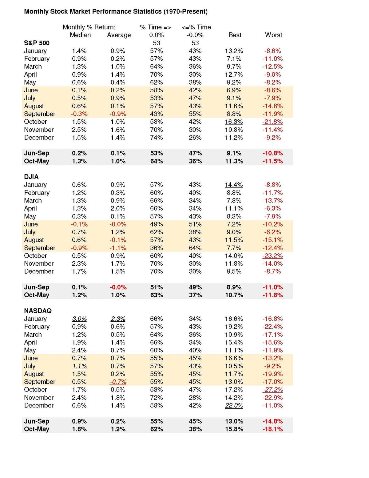 Since the inflationary 1970s, the S&P 500, Dow Jones Industrials and NASDAQ Composite have posted median and average results exceeding 1% per month from October to the following May!